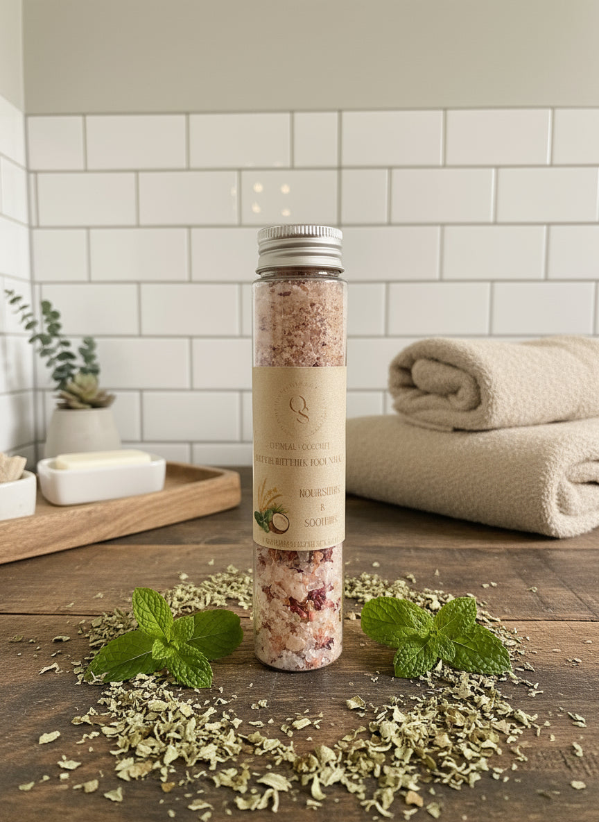 Treat your feet with Our blend of magnesium rich salts, nourishing coconut milk powder and pink clay, and peppermint essential oil to soothe and nourish your feet.